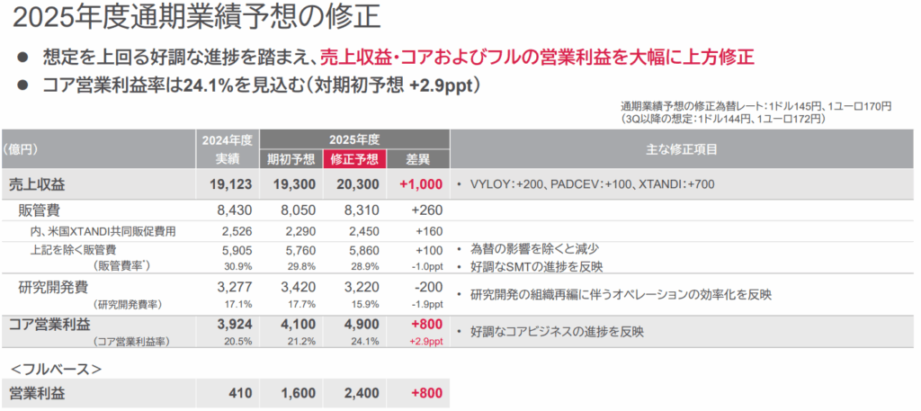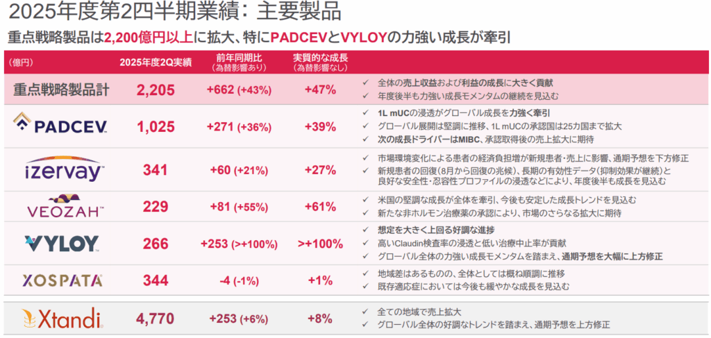 - 根拠: XTANDI(+700億円)、VYLOY(+200億円)、PADCEV(+100億円)といった重点戦略製品の売上好調。