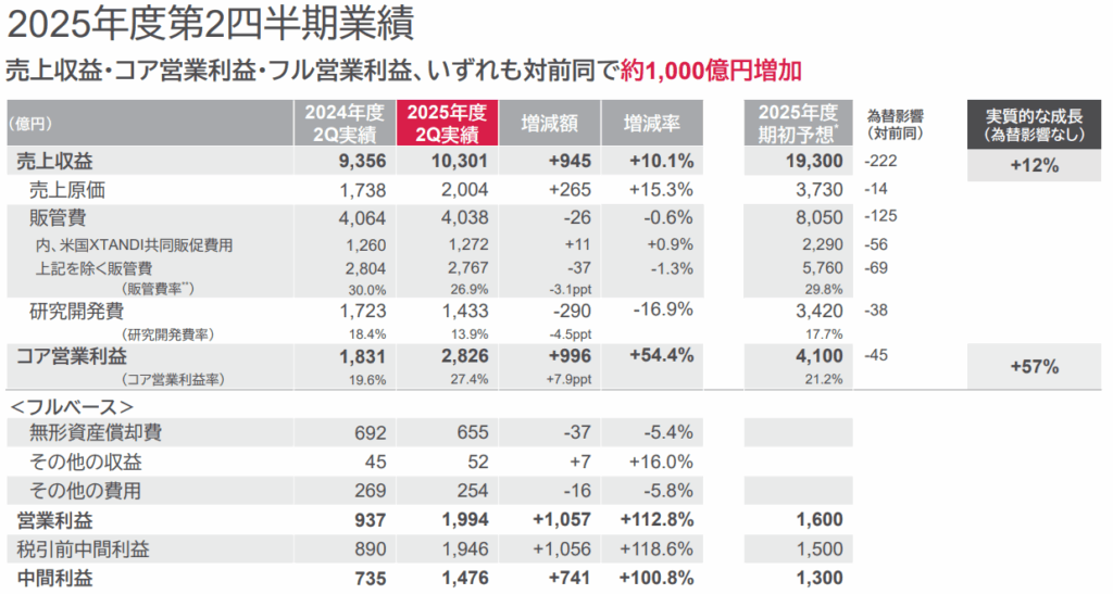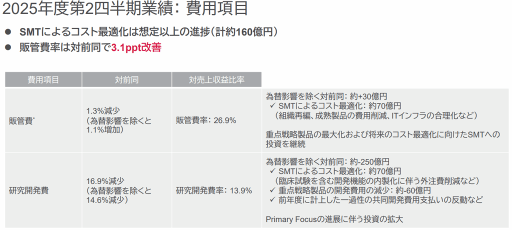 2025年度2Q決算における費用効率の改善は、主に研究開発費の削減と販管費率の改善に顕著に表れています。これにより、コア営業利益率が大幅に向上しました。