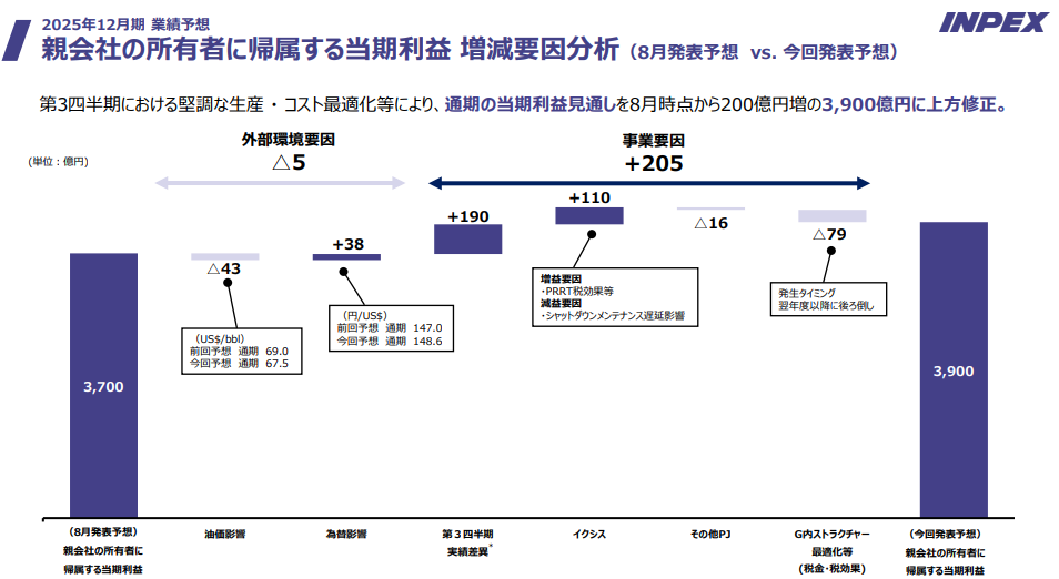 - 為替差益の計上: 3Q実績において、イクシスLNGプロジェクトを構成する子会社の資本金を一部有償減資したことに伴う為替差益243億円が「その他損益」として計上されたことも寄与しています。