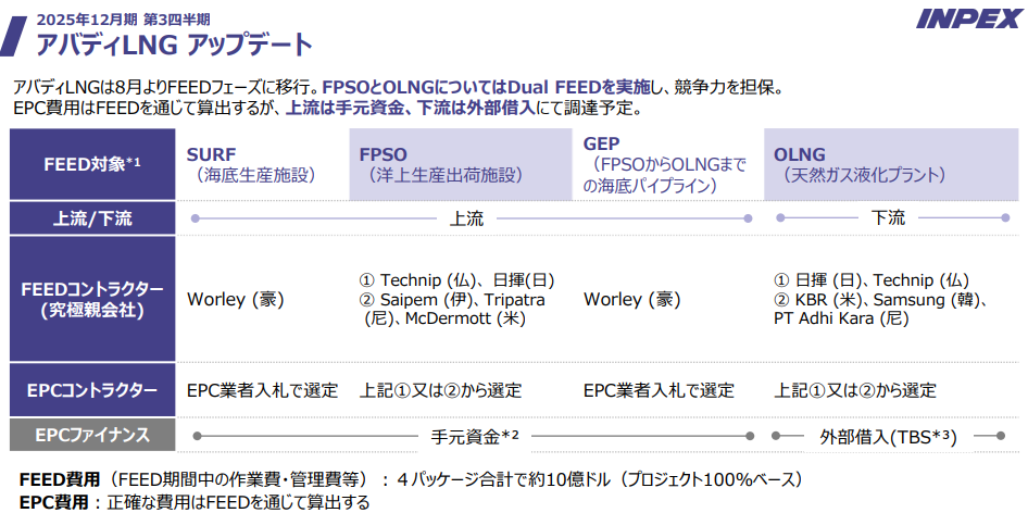 - フロントエンド・エンジニアリング・設計(FEED)の進捗: 「アバディLNGは、FEED作業が順調に進捗しています。」と明記されており、主要な開発段階であるFEED作業が計画通りに進んでいることが示されています。