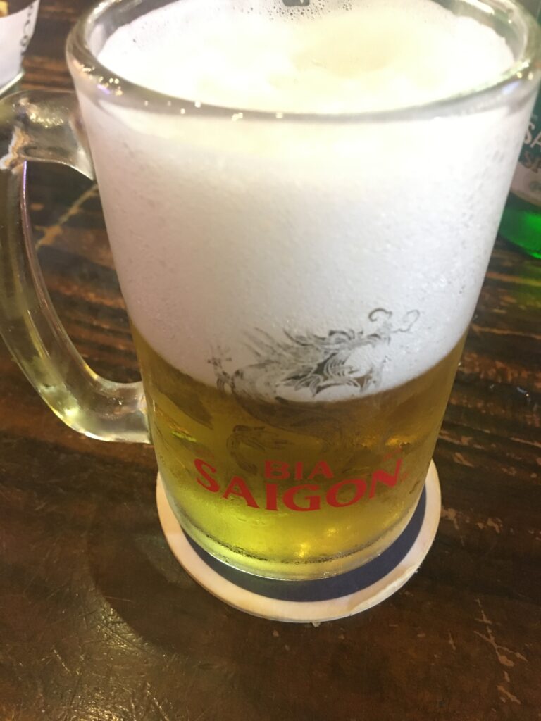 地元のサイゴンビールで一杯。美味しいです。生ビールで200~300円、コンビニの缶ビールで100円ちょいなので安いですね。最高です。