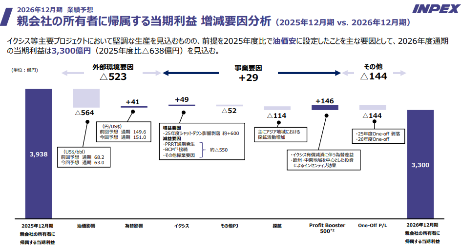 冒頭述べた通り、2026年12月期は3938億円→3300億円の減益予想となりました。